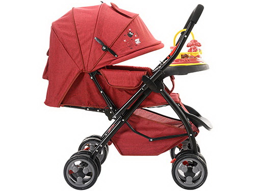 SPECIFICATION: REVERSIABLE PUSH BAR, THREE FOLDED LENEN FABRIC,ADJUSTABLE BACKREST AND FOOTREST,THREE POINT SAFEFT BELT,REAR WHEELS WITH BRAKE. COLOR: GREY,BLUE,RED,ETC.